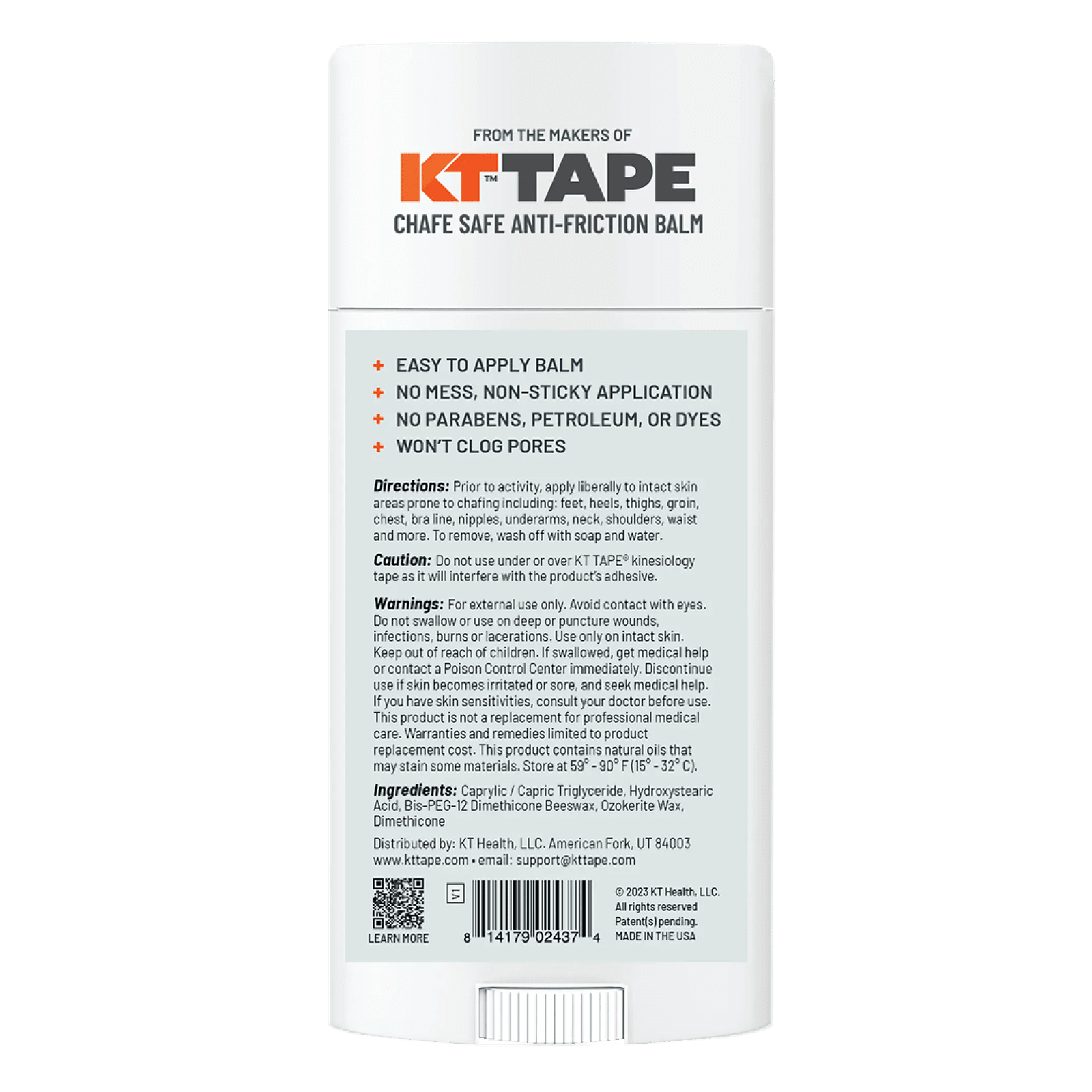 The newly redesigned KT Health Chafe Safe™ Anti-Friction Balm from KT Tape is designed to give long-lasting protection against chafing, blisters, and other skin irritations to help athletes stay focused on performing at their peak. The Balm's non-greasy stick format makes it quick and easy to apply as thin or thick a layer as desired, depending on the need. It has been tested and shown to reduce chafing-causing friction for up to 24 hours, giving you the all-day protection you need. It’s formulated with ingredients that withstand sweat and humidity to deliver all-day protection and keep you comfortable through heat, movement, and whatever activity may be planned in your day.