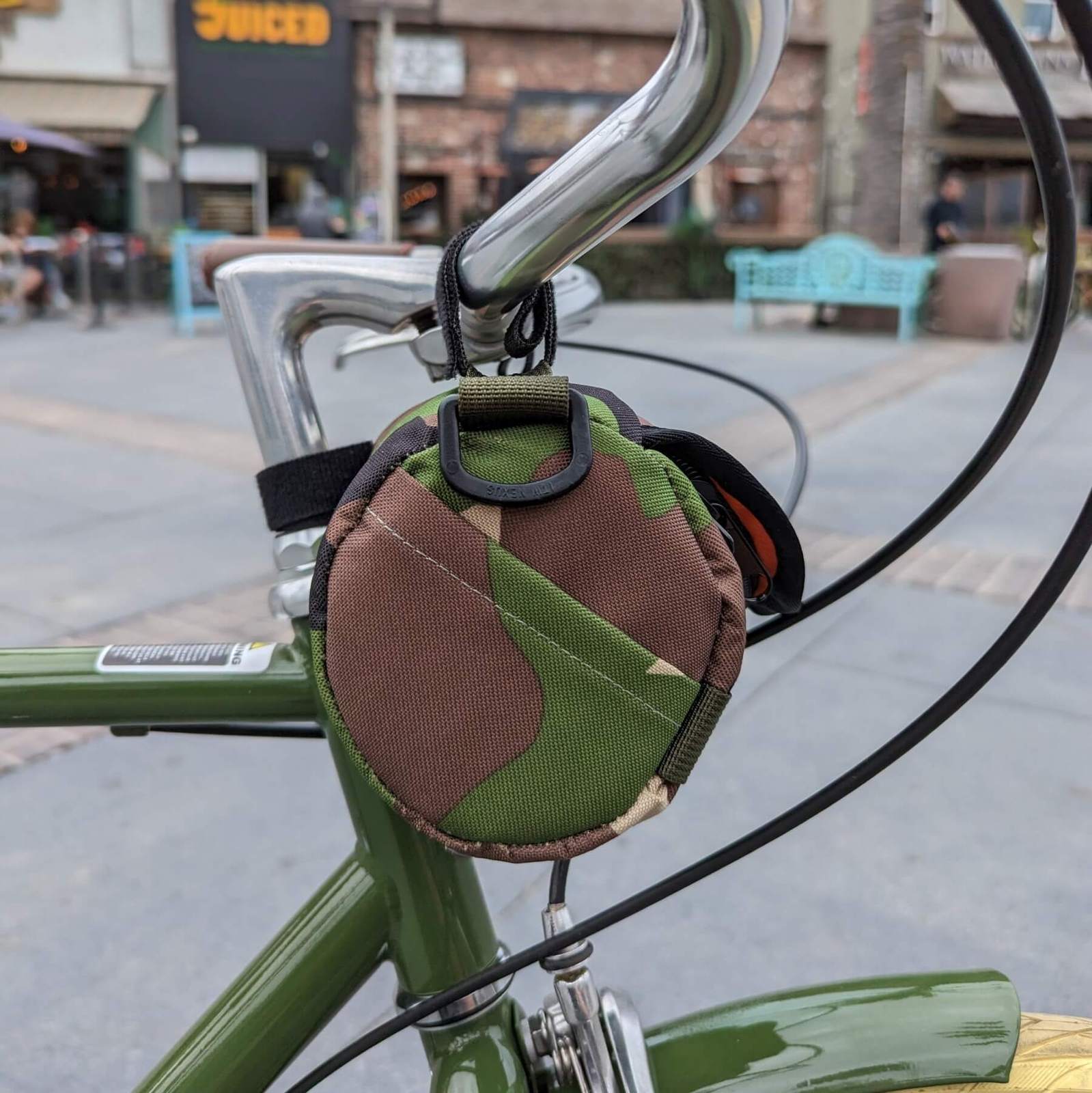 Camouflage outer means they’ll never see you coming, and the blaze orange liner lights up the inside so you can find your gummy bears and get back to riding. The coordinated olive-green webbing gives you tons of ways to strap it to the bike and strap extra gear to the outside. Sling it over your back with the optional strap and clip your tail light to the webbing for quick rides to the store or pub.