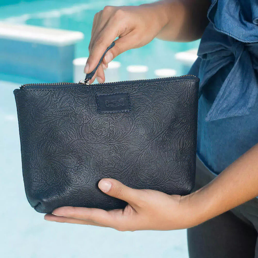 Our Heritage Tooled Leather Large Zippered Pouch is handcrafted from durable US steerhide full grain leather and features stylish pressed tooling. The high quality YKK zipper is very reliable, making this generous pouch the perfect choice to store or transport cosmetics, gadgets, cords, phone chargers, etc. Experience true quality and everyday convenience!