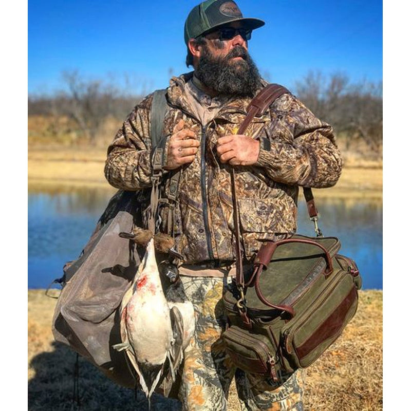 How much stuff do we need to go afield? If you're like most outdoorsmen, it's whatever your pack will hold. Our Guide Bag is large enough to carry the necessities: binoculars, flashlight, calls, compass, extra cartridges or shells, dad's old lucky knife, maybe even a can of potted meat, some crackers, and bottled water. Built of tough waxed canvas, 100 percent full-grain leather and #10 YKK solid brass zippers, the Guide Bag is as rugged as an elk guide and as handsome as a palomino packhorse. Our Vintage Camo version is an extremely durable, weather-resistant, double-layered polyester fabric and has a higher heat resistance than nylon cordura.