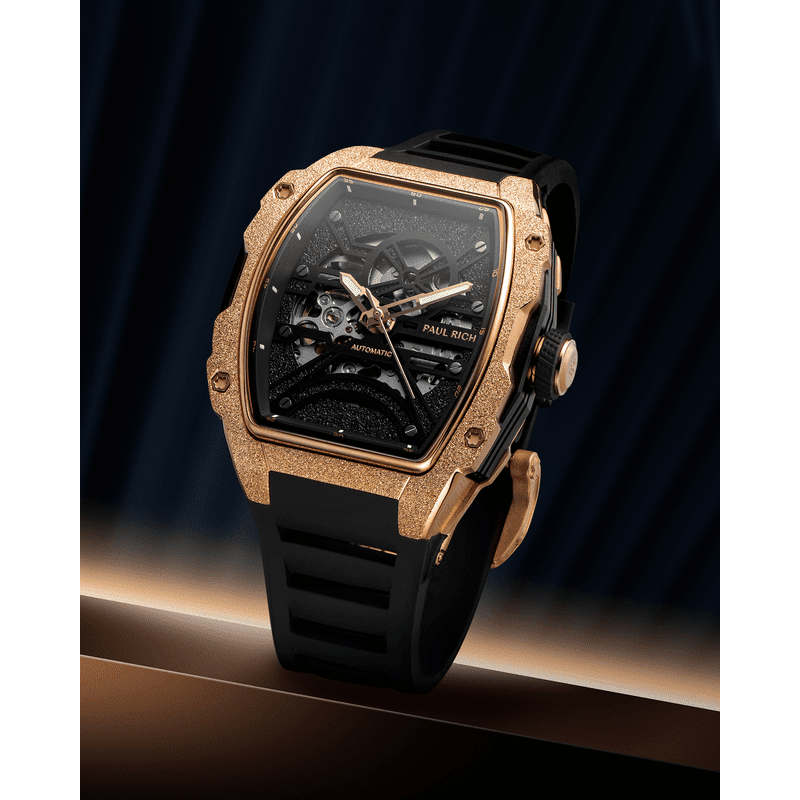 Introducing the Paul Rich Astro Skeleton—a tonneau-shaped masterpiece that seamlessly integrates innovation with sophistication. Its transparent skeleton dial unveils the intricate mechanics beneath, showcasing frosted baseplates and bridges. You can also appreciate the movement within through the open case back.