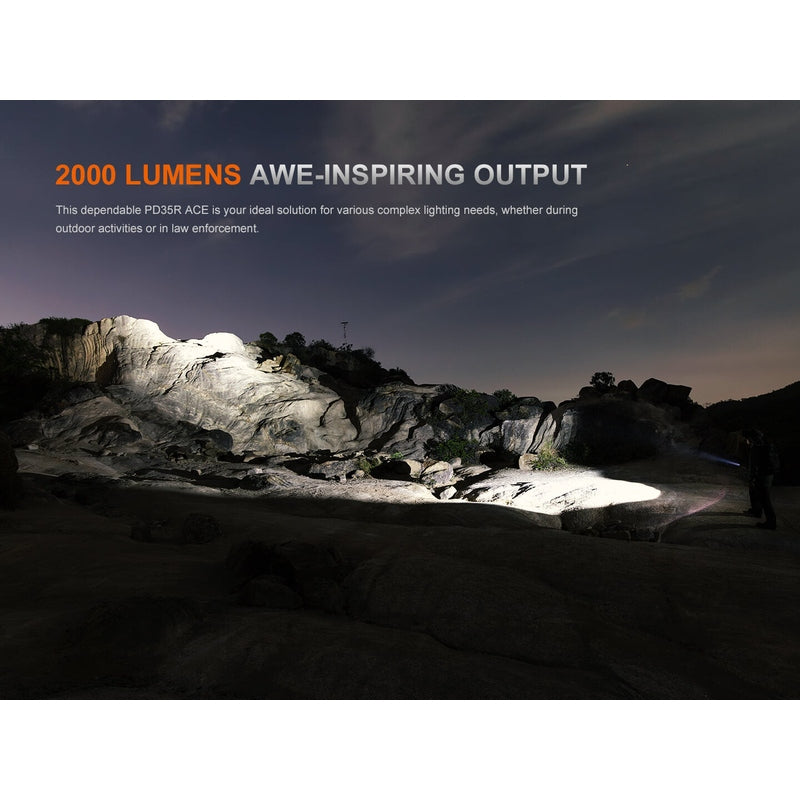 Meet the Fenix PD35R ACE Multi-mode Tactical Flashlight: a powerful, precision-engineered lighting tool built for professionals and enthusiasts who demand peak performance. Delivering an intense 2000 lumen output and an impressive beam distance over 1000 feet, this flashlight ensures maximum visibility in the darkest environments. Its patented SET output customization allows you to switch effortlessly between three distinct mode selection profiles, making it ideal for a variety of tactical and everyday applications, particularly with a customizable strobe that will give you greater control over signaling and disorienting potential threats. A discreet hidden USB-C charging port keeps your gear streamlined while ensuring fast, reliable recharging. Designed with simple two-switch operation for intuitive control, the PD35R ACE also boasts up to 90 days of runtime on eco mode, IP68 waterproofing, and 1.5-meter impact resistance for unmatched durability in the field. Rugged, versatile, and relentlessly reliable, this is the flashlight that outshines the competition.