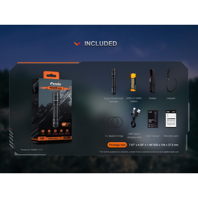Built for durability, the PD45R ACE features a lockout function to prevent accidental activation and a hidden USB-C charging port that keeps the design sleek and protected. The included 6,000 mAh battery offers long-lasting runtime, ensuring you're always prepared. Fenix’s patented SET Customization technology lets you tailor the flashlight’s output and functions to meet your exact needs. With an IP68 waterproof rating, the PD45R ACE is ready for any mission, no matter the conditions.