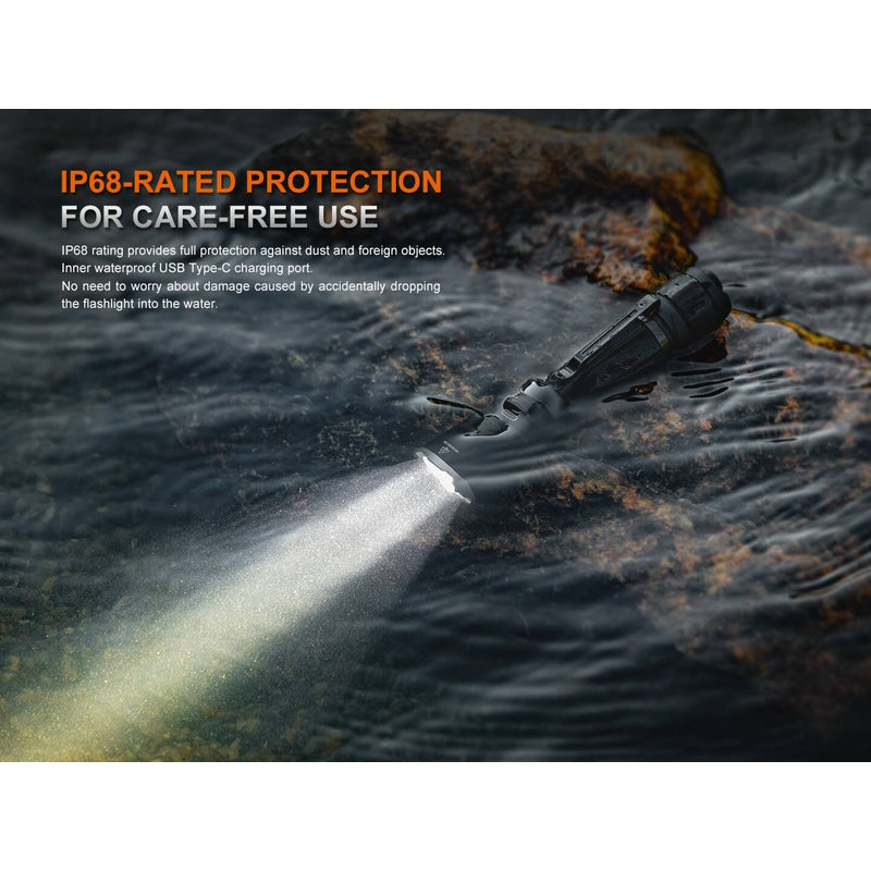Crafted for duty use, the flashlight boasts rugged IP68 waterproofing and 1.5-meter drop resistance. Intelligent overheat protection preserves internal components during extended use, and the included 6000mAh 21700 rechargeable battery ensures lasting performance on the job.