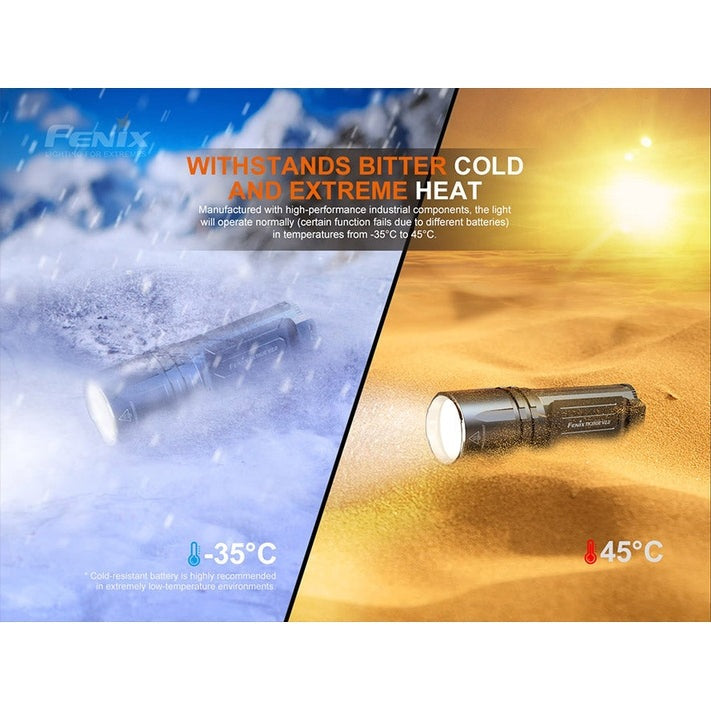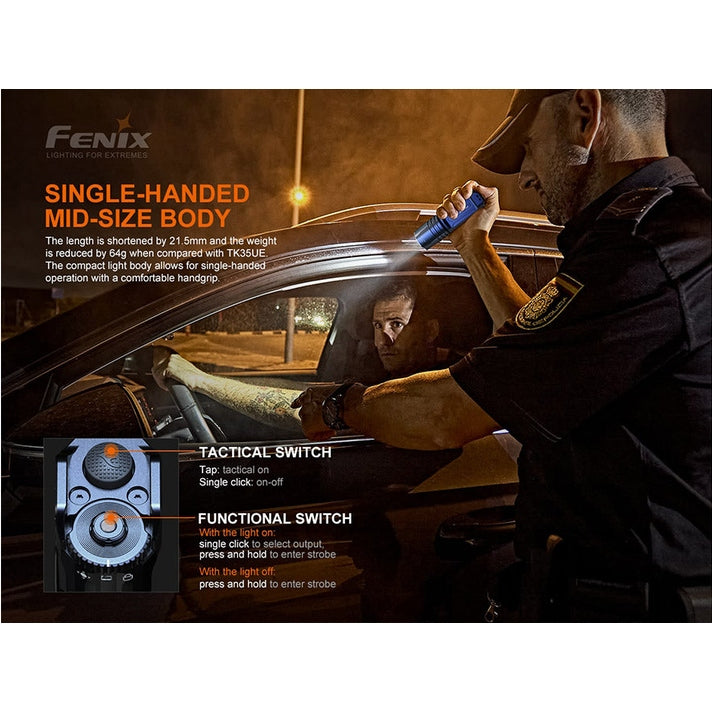 The Fenix TK35UE V2.0 is a top-tier flashlight designed to provide up to 5000 lumens of illumination with a maximum throw distance of over 1,300 ft (400 meters). Utilizing a mechanical toggle switch, users can switch between Tactical, Duty, and Lockout modes for quick responses. Additional features such as the Instant Strobe, Lockout function, and flat body design make this device ideal for a variety of lighting needs. It is powered by two 18650 batteries (*batteries not included*).