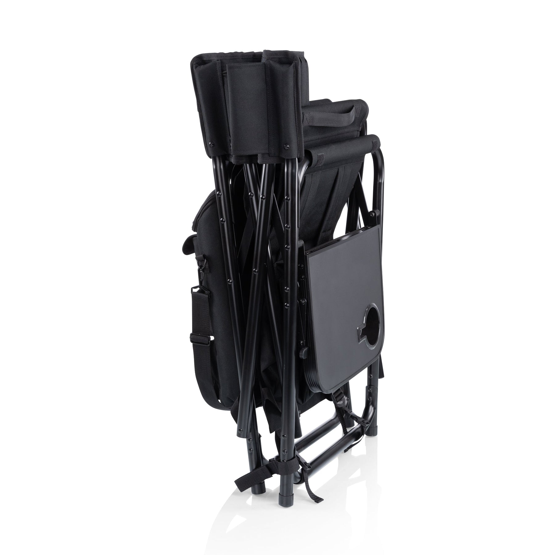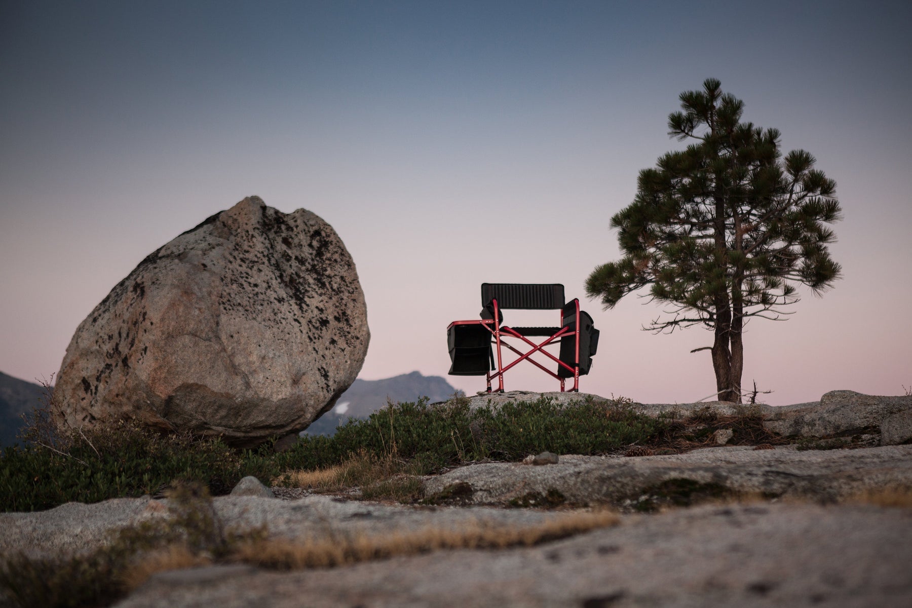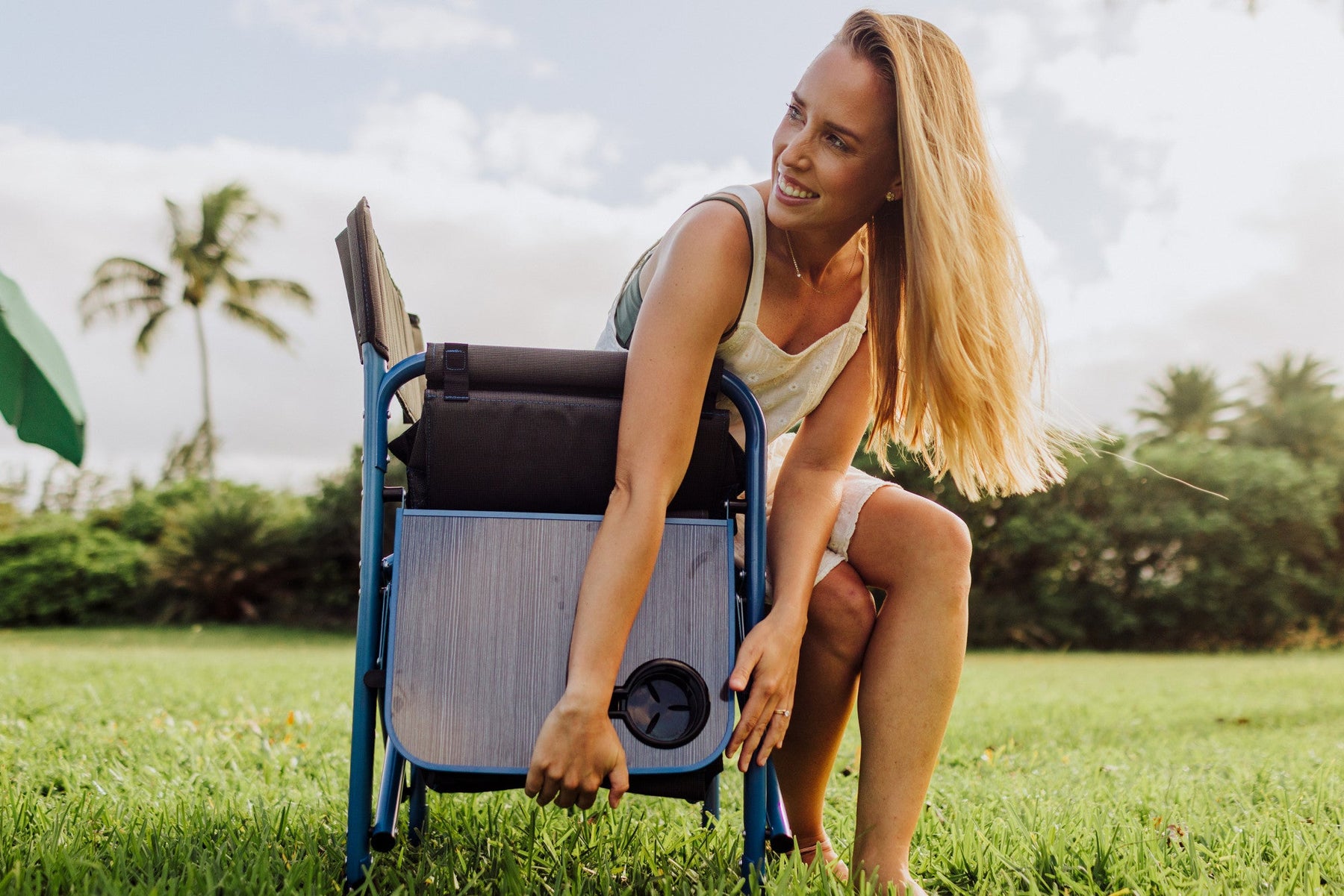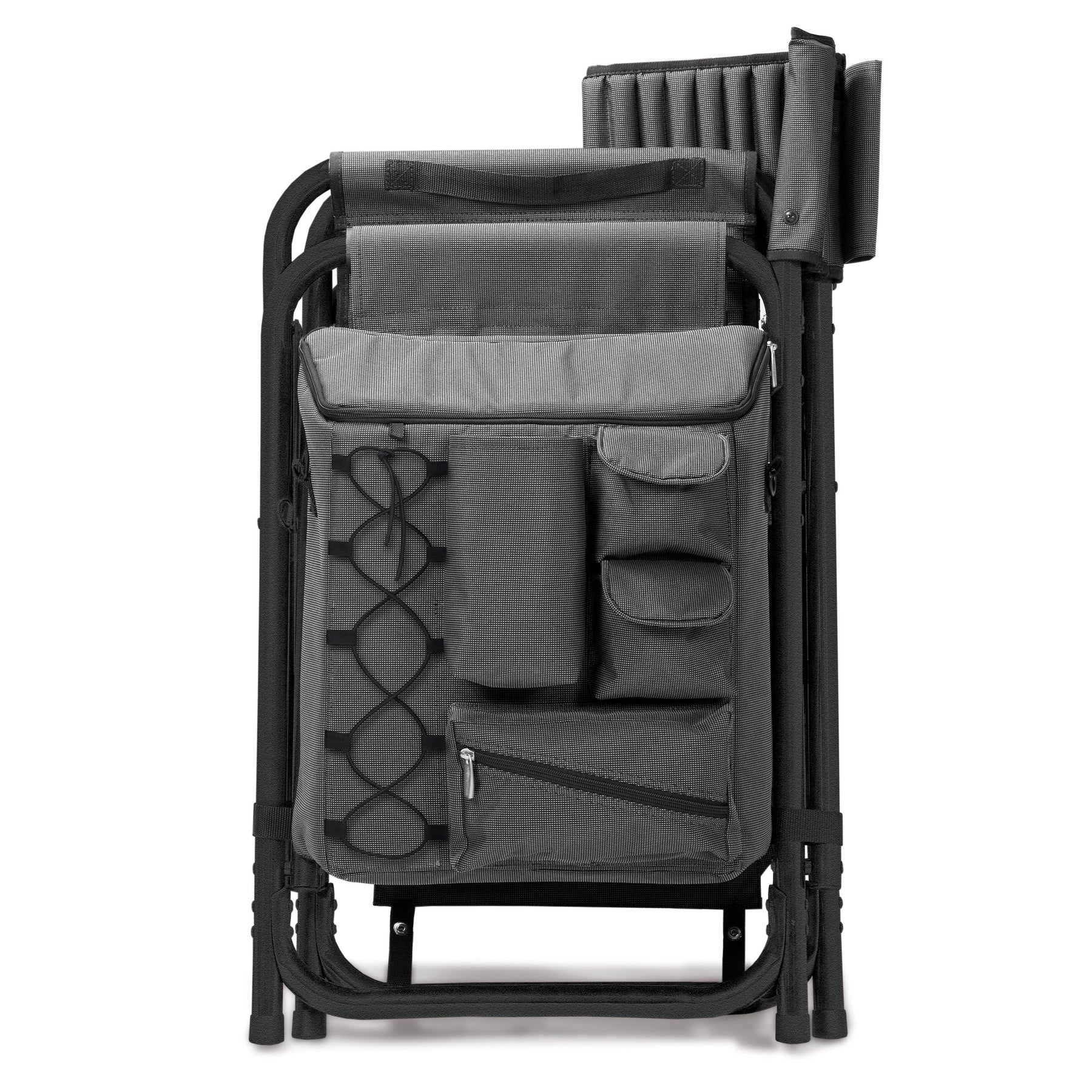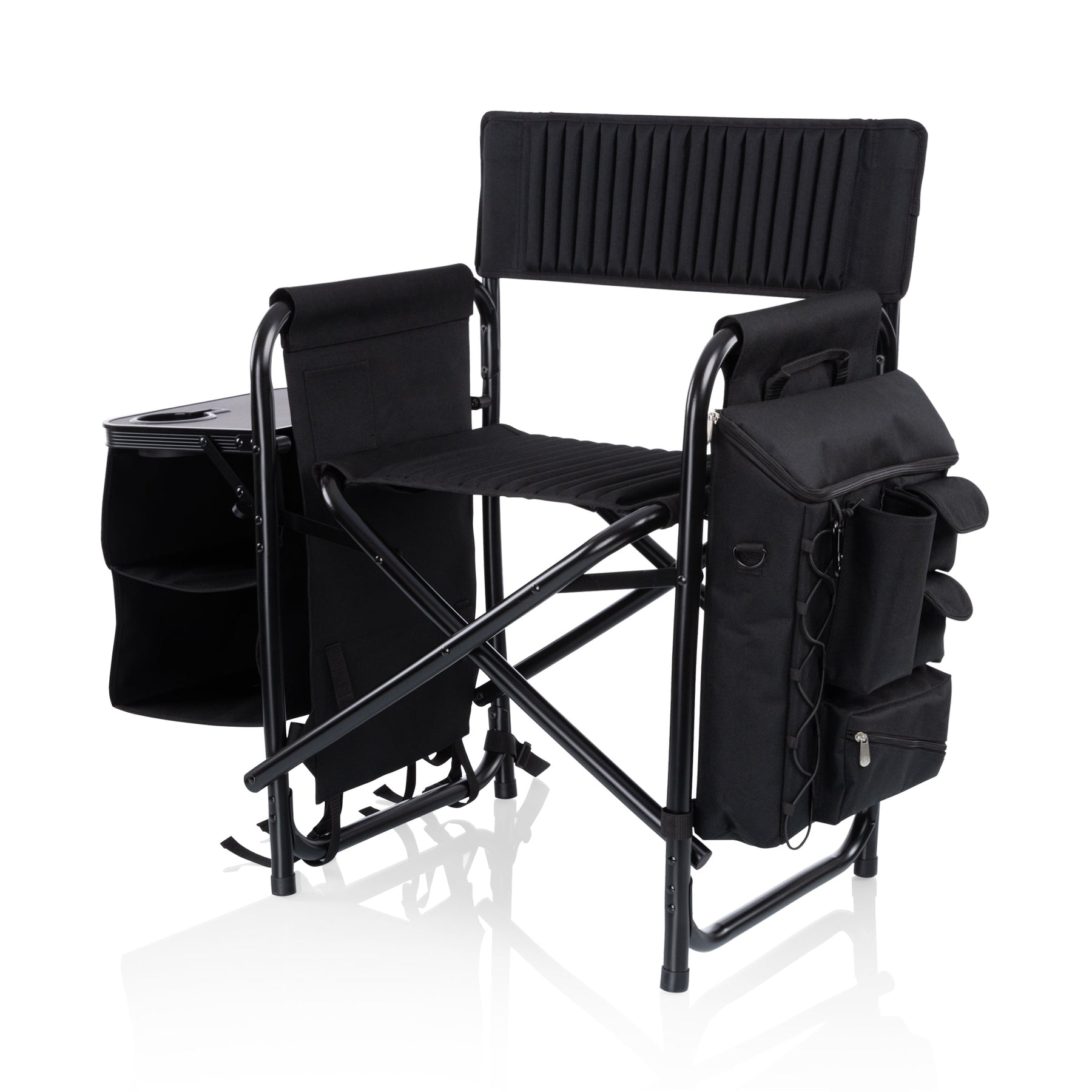 The Fusion Camping Chair is a heavy duty portable camp chair with so many features, you might make it your new office! A durable, powder-coated aluminum frame and ribbed padding in the seat and back rests is only the beginning - this outdoor chair with table on the right side also includes a two-tiered, accordion-style shelves hanging below, plus a side-mounted, fully-detachable 24+1-can-capacity cooler with its own backpack straps, a cell-phone-specific pocket, specialized fabric loops for an umbrella or sports banner, and numerous pockets. The Fusion is more than an outdoor portable chair, it's a camp chair, a beach chair, and heck - a lawn chair relaxation throne. All that and it’s still lightweight enough to be easily portable yet strong enough to hold up to 350 lbs?! This is an outdoor directors chair that never disappoints.