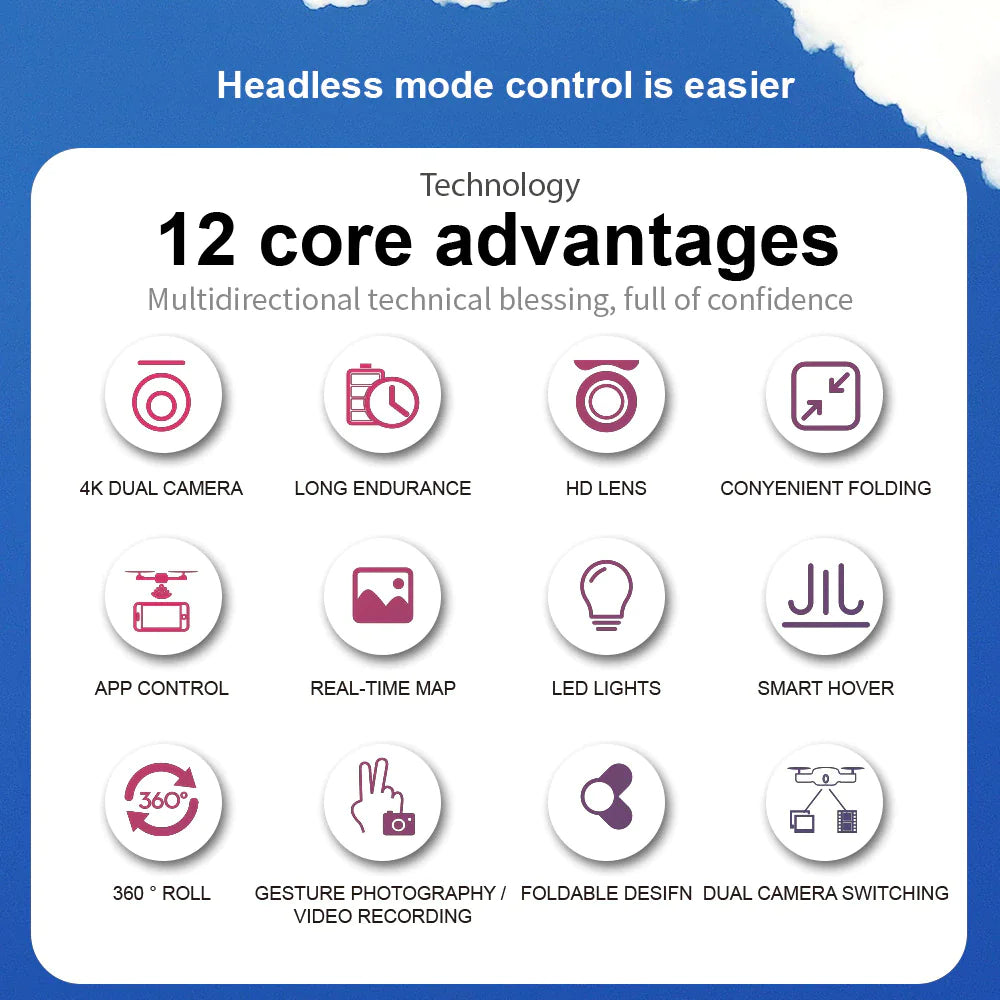 Automatic hovering (auto hover) / Altitude hold, First person view (FPV), One-key take-off & landing , One-key flip & roll/Follow me, Trajectory Flight, Fly agilely & more. Great fun drones with camera for adults.