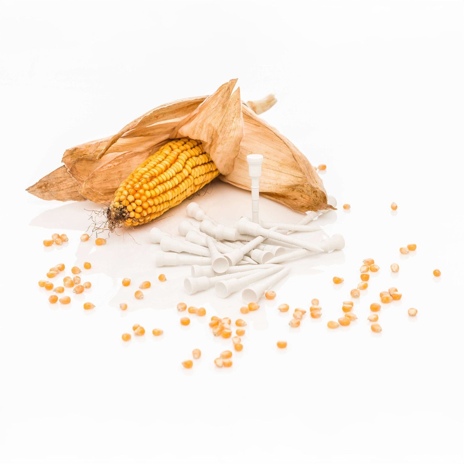 ECO-FRIENDLY PRODUCTION. The Tees are made from a biopolymer developed especially for us, which consists of 99% corn, a renewable and extremely resource-conserving raw material. This makes the Ecoline-Tee biodegradable and CO2-neutral. Thanks to a customized production process, a stable Tee has been created that meets all requirements. The short transport route from production to the warehouse also ensures a minimal carbon footprint.