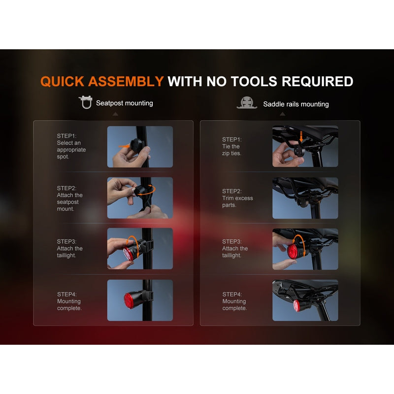 The Fenix BC06R Smart-Brake Bicycle Taillight is a high-performance safety light designed for cyclists who value visibility and convenience. Featuring smart brake sensing, it instantly boosts brightness to a 90-lumen burst when braking, alerting others up to 100 meters away. With versatile mounting options for seatposts (25.4-31.6mm) and saddle rails (39-50mm), it fits most bikes with ease. The light offers a 270° lighting angle, multiple modes (including flashing and spinning light modes), and an impressive 24.5-hour runtime. It fully charges in just 2 hours via USB Type-C and boasts IP66 waterproofing, making it durable for all-weather riding.