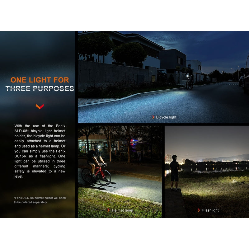 Its design includes side illumination for enhanced visibility, ensuring safety in low-light conditions.  User-friendly in design, it features a single-switch operation allowing easy mode transition. The quick-release handlebar mount adds to its convenience, fitting a range of handlebars for easy attachment and removal. Durability is a key feature, with the BC15R boasting 1.5-meter drop resistance and an IP66 water resistance rating, making it capable of withstanding diverse riding conditions. The Fenix BC15R is not just a light; it's a reliable, durable, and essential partner for every cycling adventure.