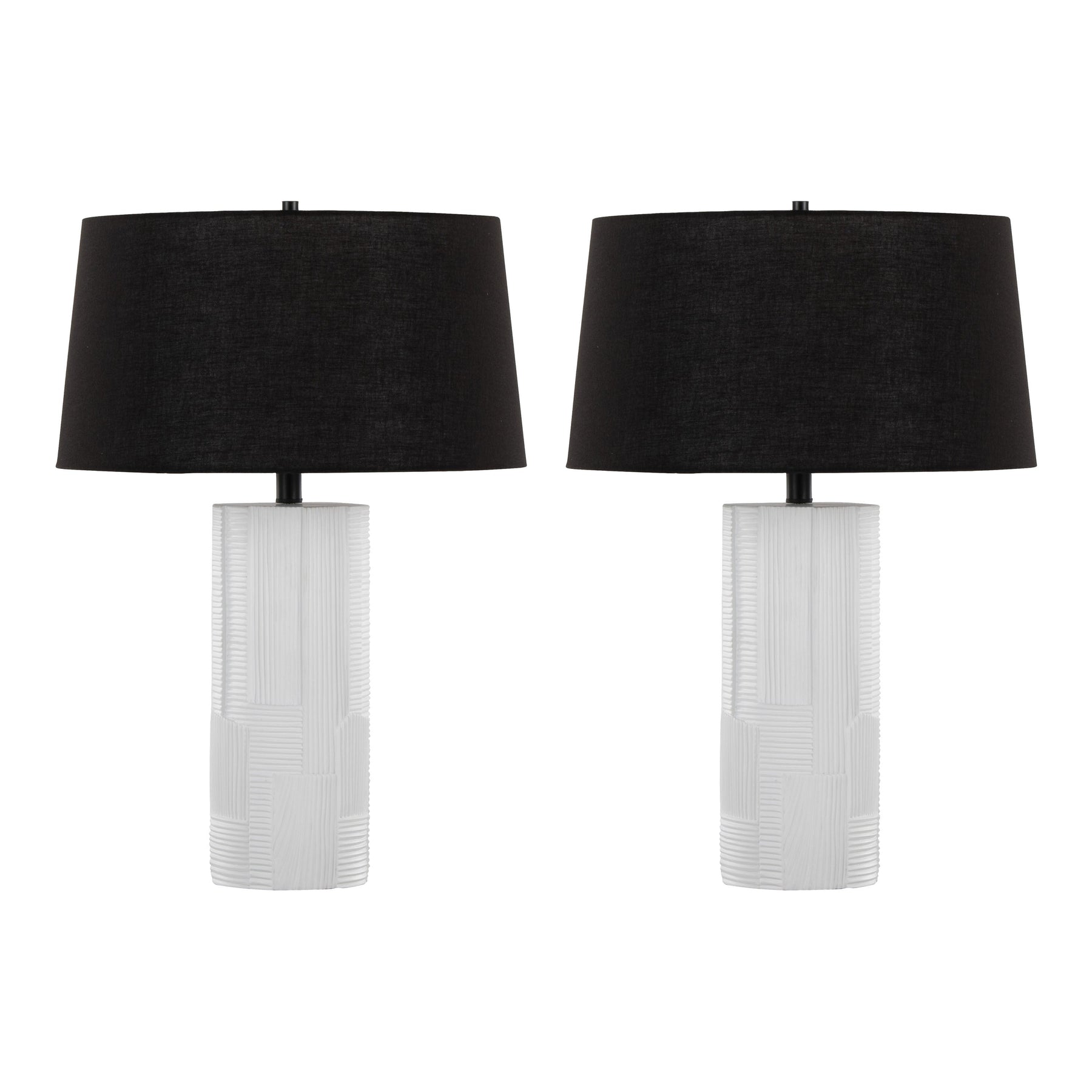 The Petra Table Lamp set features two contemporary lamps ideal for living rooms or bedrooms, combining textured cream bases with sleek black shades for versatile lighting and style.