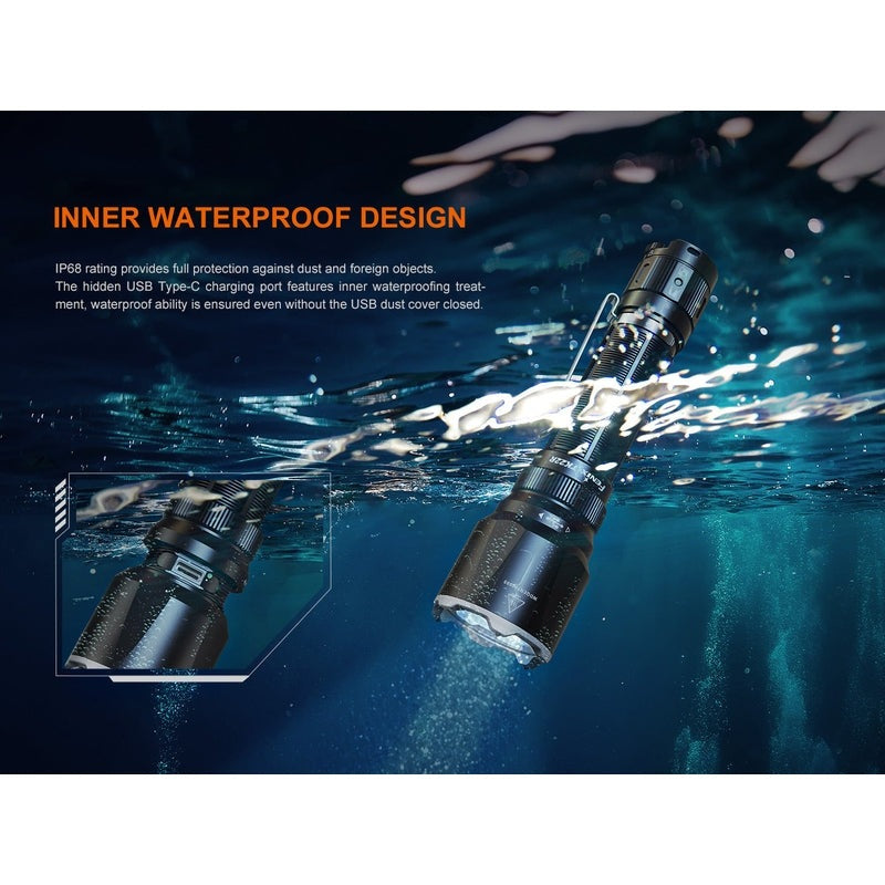 The Fenix TK22R features a 3200 lumen maximum output, seamless transition between tactical and duty modes, and the Patented Flexi-sensa Control Switch for intuitive operation. Its hidden USB-C charging port ensures swift recharging, complemented by the robust 5000mAh included battery. This flashlight boasts durability with tungsten steel alloy striking tips and double springs, optimized for tactical use. Innovative APF technology ensures consistent brightness, while intelligent overheat protection keeps performance optimal. Even with its charging port exposed, its resilience shines through, maintaining a waterproof rating of IP68.