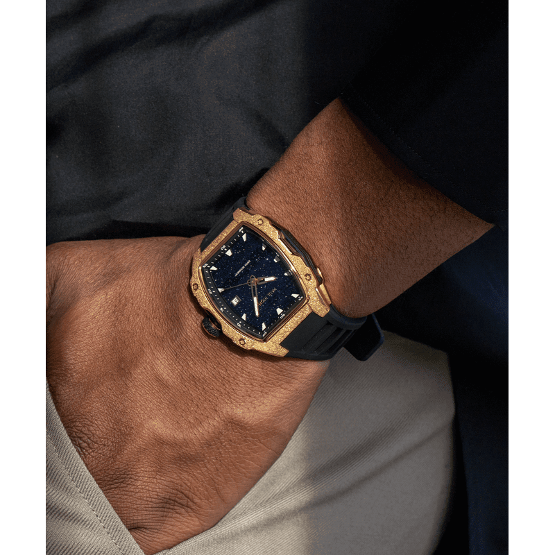 A frosted, tonneau-shaped icon that merges bold style with high-end innovation. The aventurine stone dial captures the cosmic feel, while luminous hands and markers guarantee clarity, day or night.