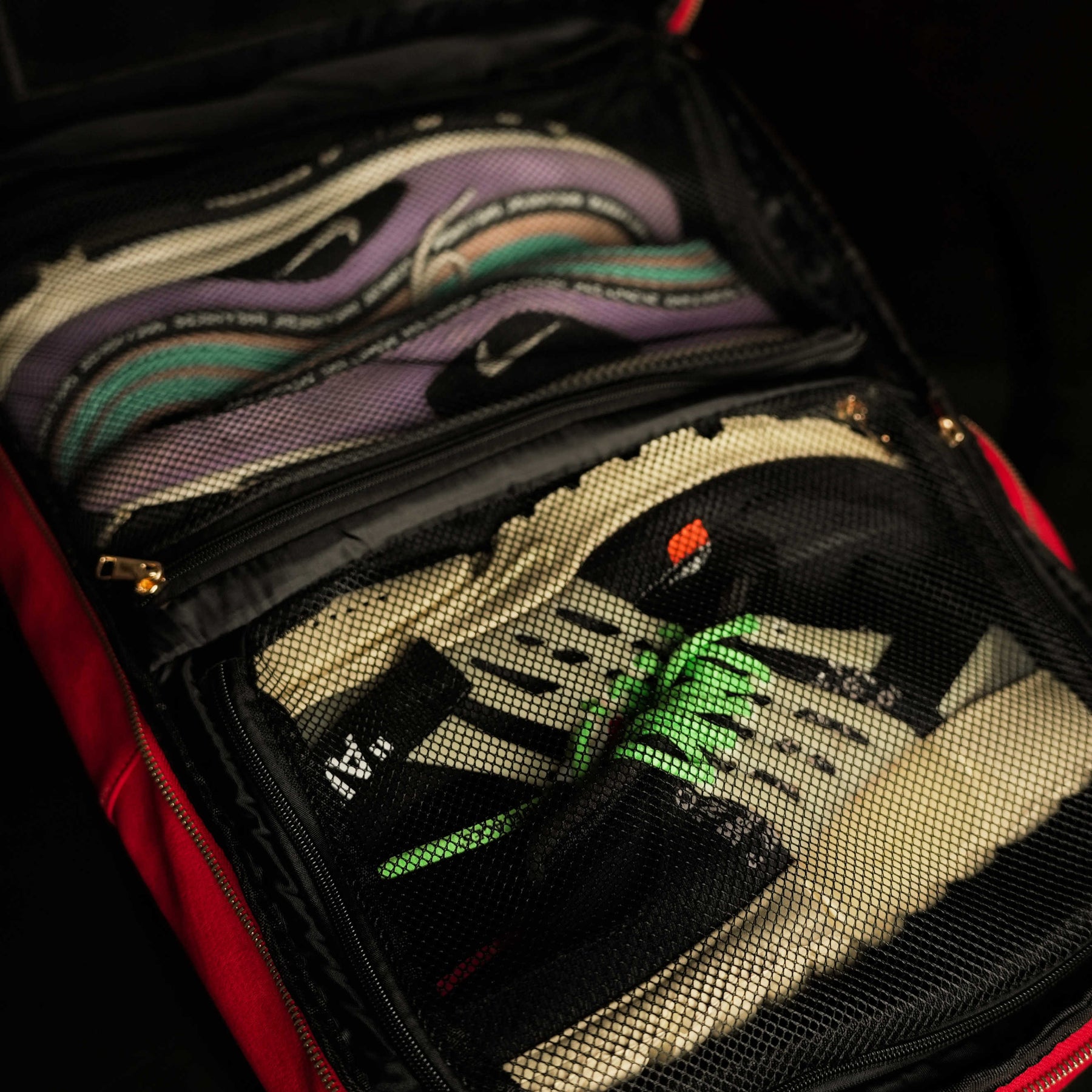 Our Red Leather Daily Commuter bag can hold 2-3 pairs of shoes up to size 15, clothes, a laptop, a tablet, headphones, and more! Traveling just got easier!