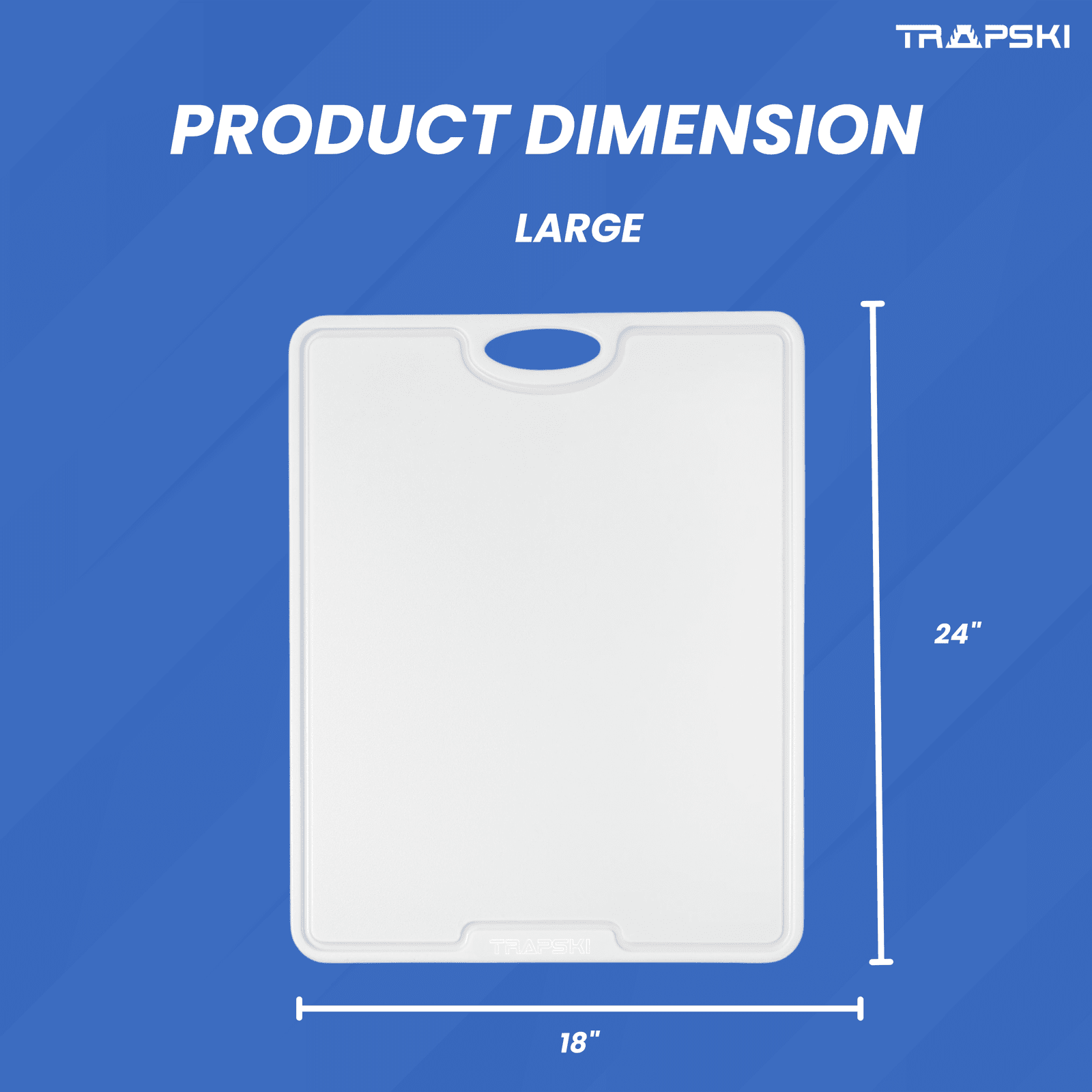 Upgrade your kitchen prep with the TRAPSKI HDPE Cutting Board – built for serious cooks who demand durability, safety, and easy maintenance. Made from high-density polyethylene, our cutting board is knife-friendly, stain-resistant, and fully dishwasher safe. The non-porous surface prevents bacteria buildup while the built-in juice grooves help keep your counters clean. Available in professional Natural white and white blue accented trim, it's the perfect fit for your home kitchen, outdoor prep area, or commercial kitchen, boat, RV, camping or cabin get-away.