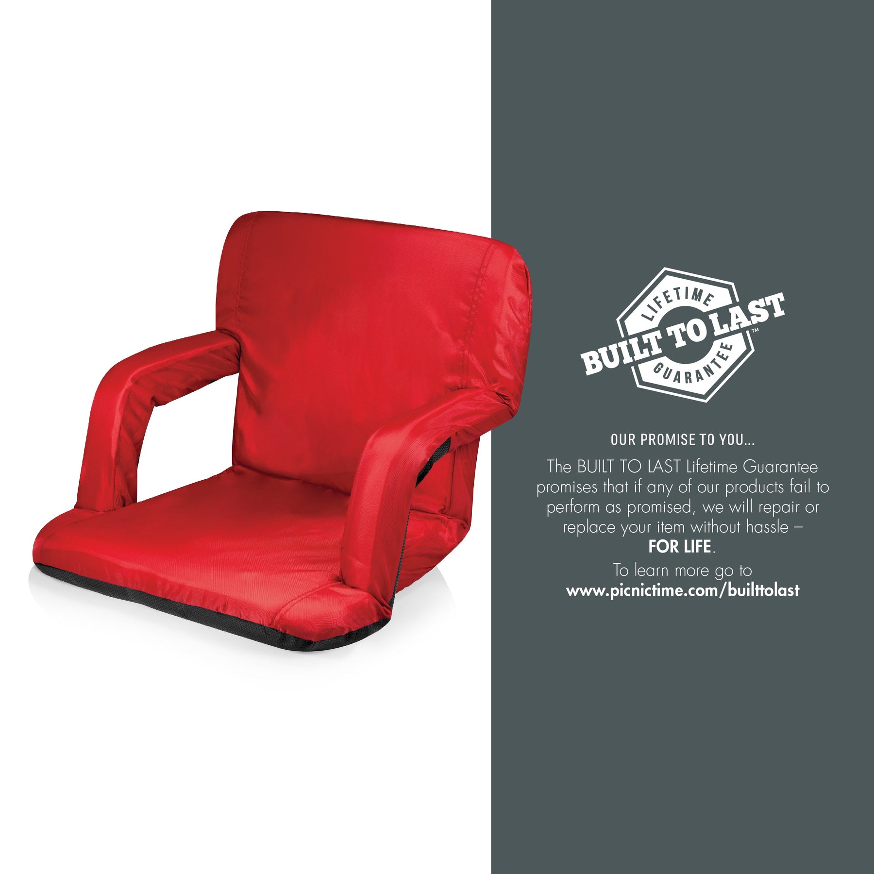 With six backrest positions, padded armrests, and high-density foam padding, the Ventura Reclining Stadium Seat with Back Support is a deluxe yet lightweight and highly-portable folding stadium seat. The lightweight steel frame, sturdy polyester canvas, water-resistant bottom, large exterior zipper pocket, and adjustable shoulder straps make this your go-to travel sports chair! This stadium seat is perfect for spectating in comfort, whether you're watching the pros or your kids (future pros), for lounging on the beach in exquisite comfort, for enjoying the great outdoors on a reclining camp ground chair, and more. This reclining chair with no legs makes the world your cozy seat - your buns and back will thank you every time you ease into the high-density foam comfort of the Ventura. Adjustable backpack straps make this bleacher seat with back totally portable, and you can even invert the armrests to create up to 20" of added width to the seat. Explore flat-folding chair's six backrest positions to find the perfect groove for you. Whether you're watching the game or gaming with your buddies, whenever you need a flexible seat on the go, the Ventura Reclining Stadium Seat elevates kicking back.