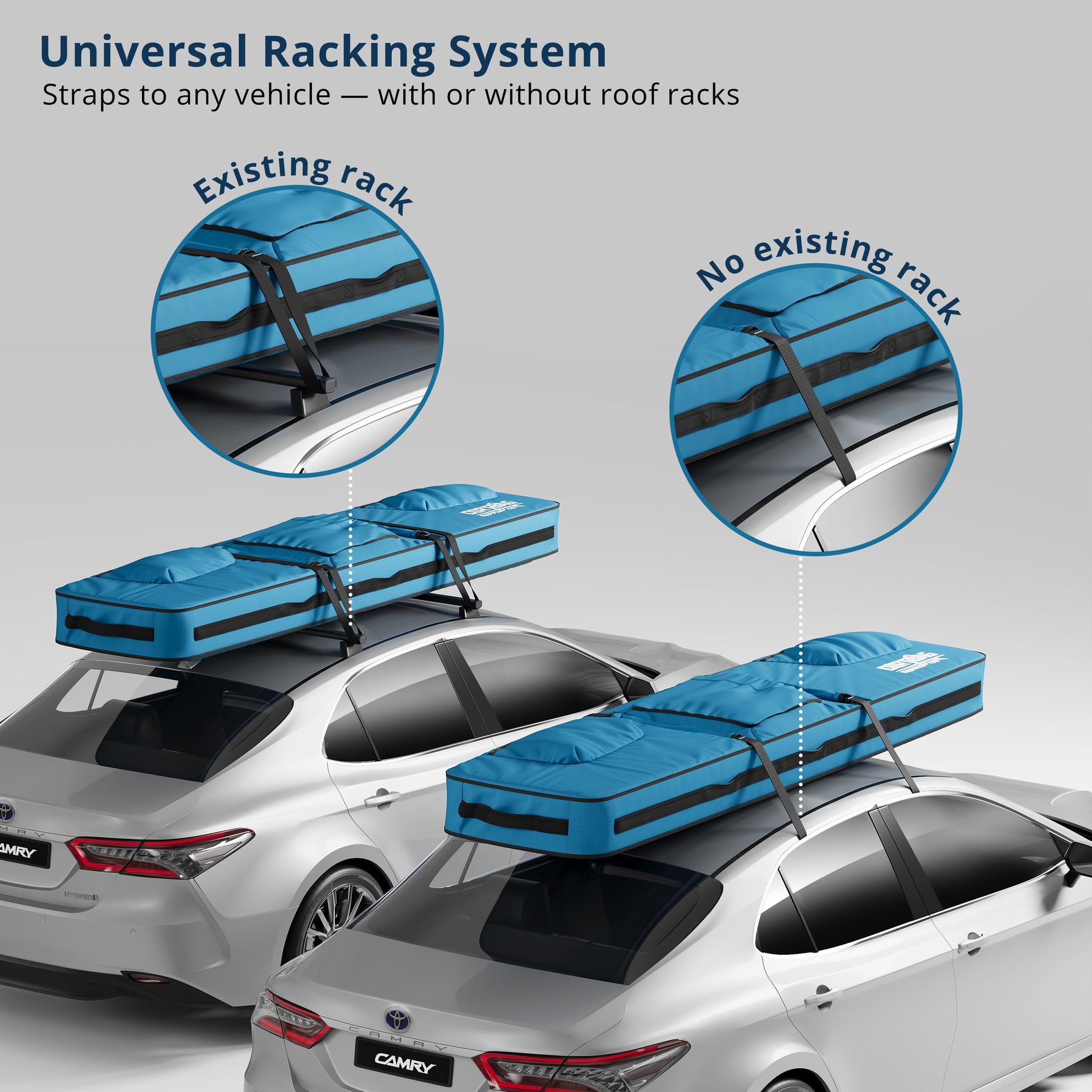 • Universal Racking System (URS). Our patented URS contains everything you need to rack your bag onto any vehicle’s roof, with or without hard racks. Bottom rails provide protection and cushioning for on-roof transportation. Integrated 1.5 inch cam buckles and included tie down straps ensure that your bag is always ready for adventure.