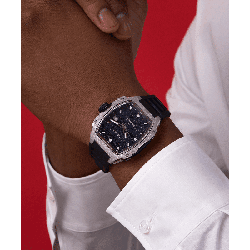 A frosted, tonneau-shaped icon that merges bold style with high-end innovation. The aventurine stone dial captures the cosmic feel, while luminous hands and markers guarantee clarity, day or night.