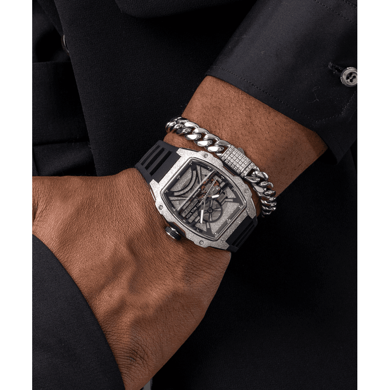 Introducing the Paul Rich Astro Skeleton—a tonneau-shaped masterpiece that seamlessly integrates innovation with sophistication. Its transparent skeleton dial unveils the intricate mechanics beneath, showcasing frosted baseplates and bridges. You can also appreciate the movement within through the open case back.