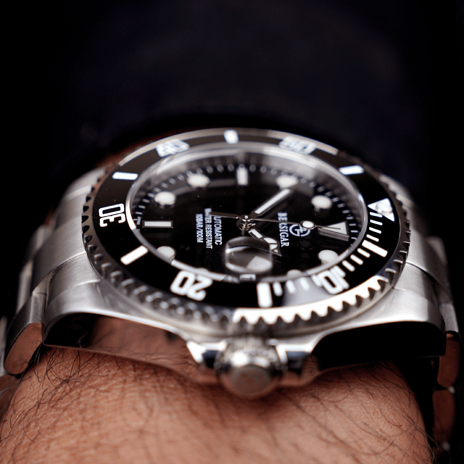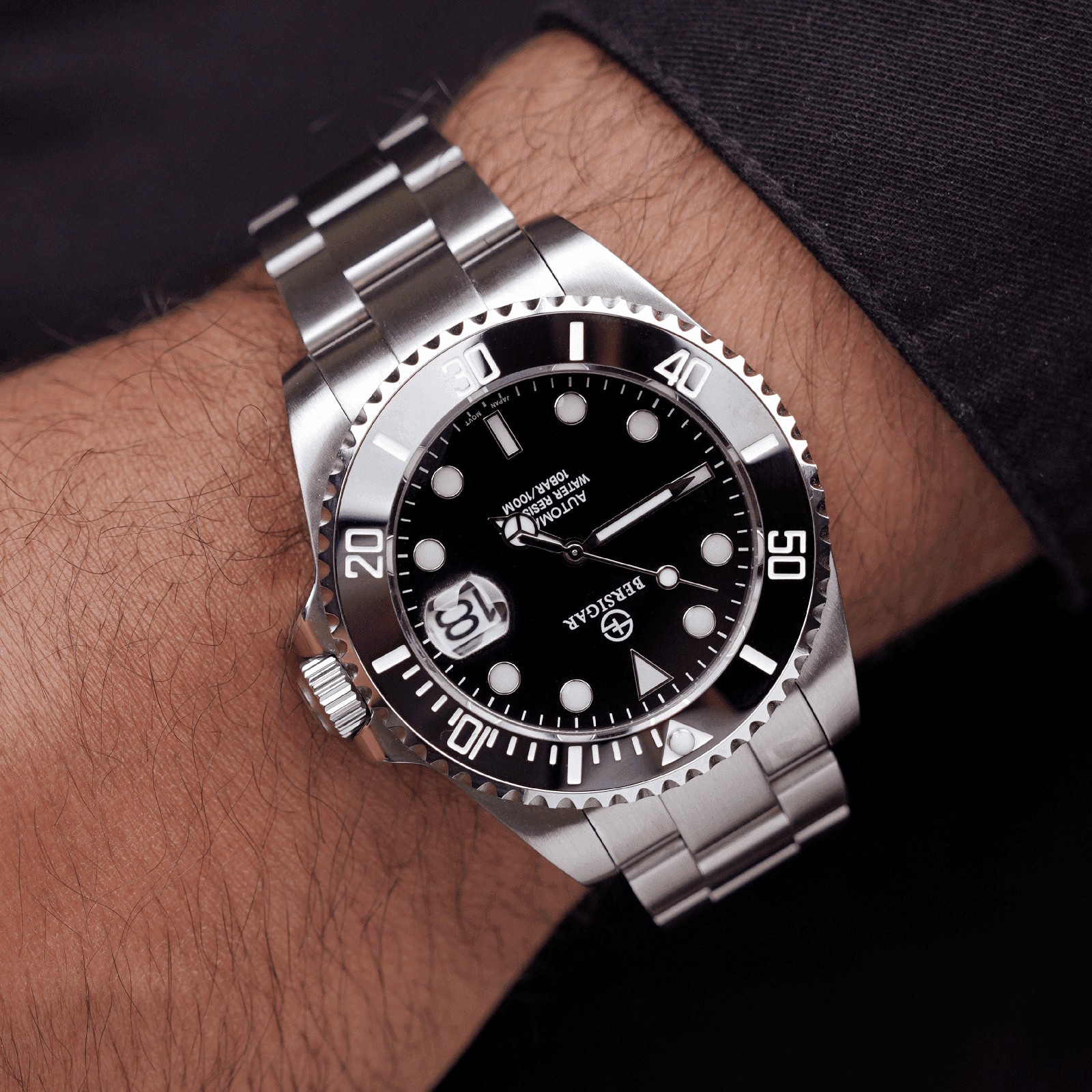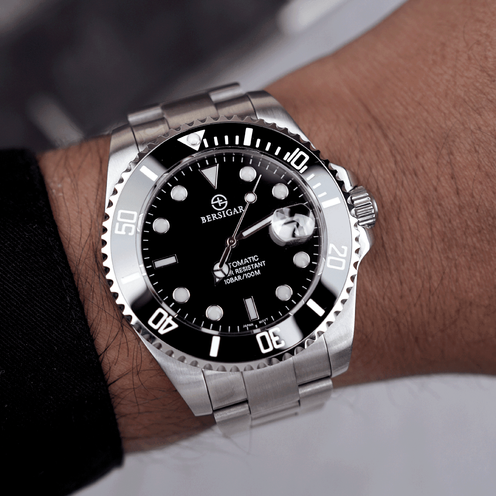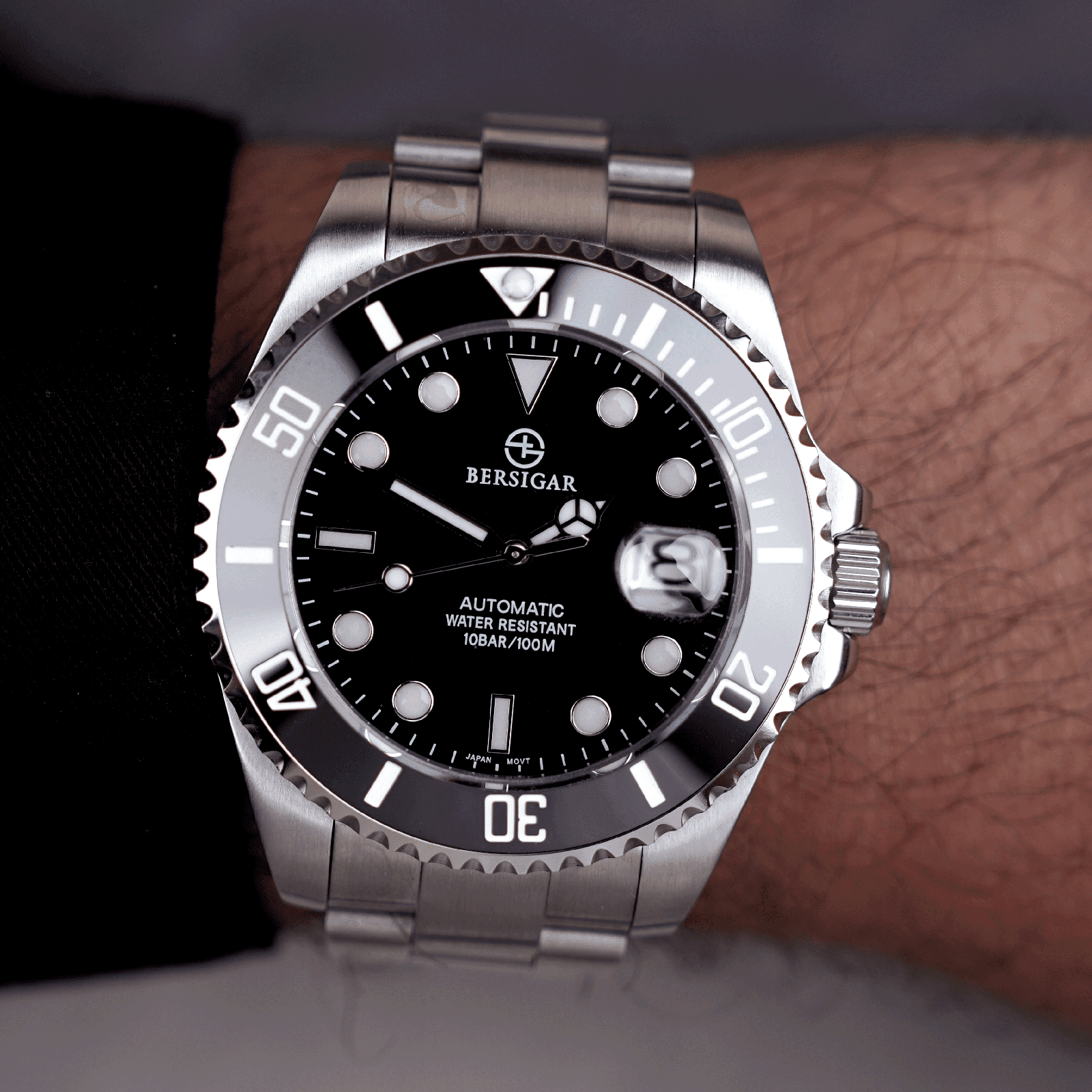 Bersigar Luxaura 1639 Black Premium materials and casual design, Sapphire dial window, full 316L stainless steel construction with screw-down crown, ceramic bezel can be rotated counterclockwise and transparent case back, solid and flexible watchband with classic deployment clasp.