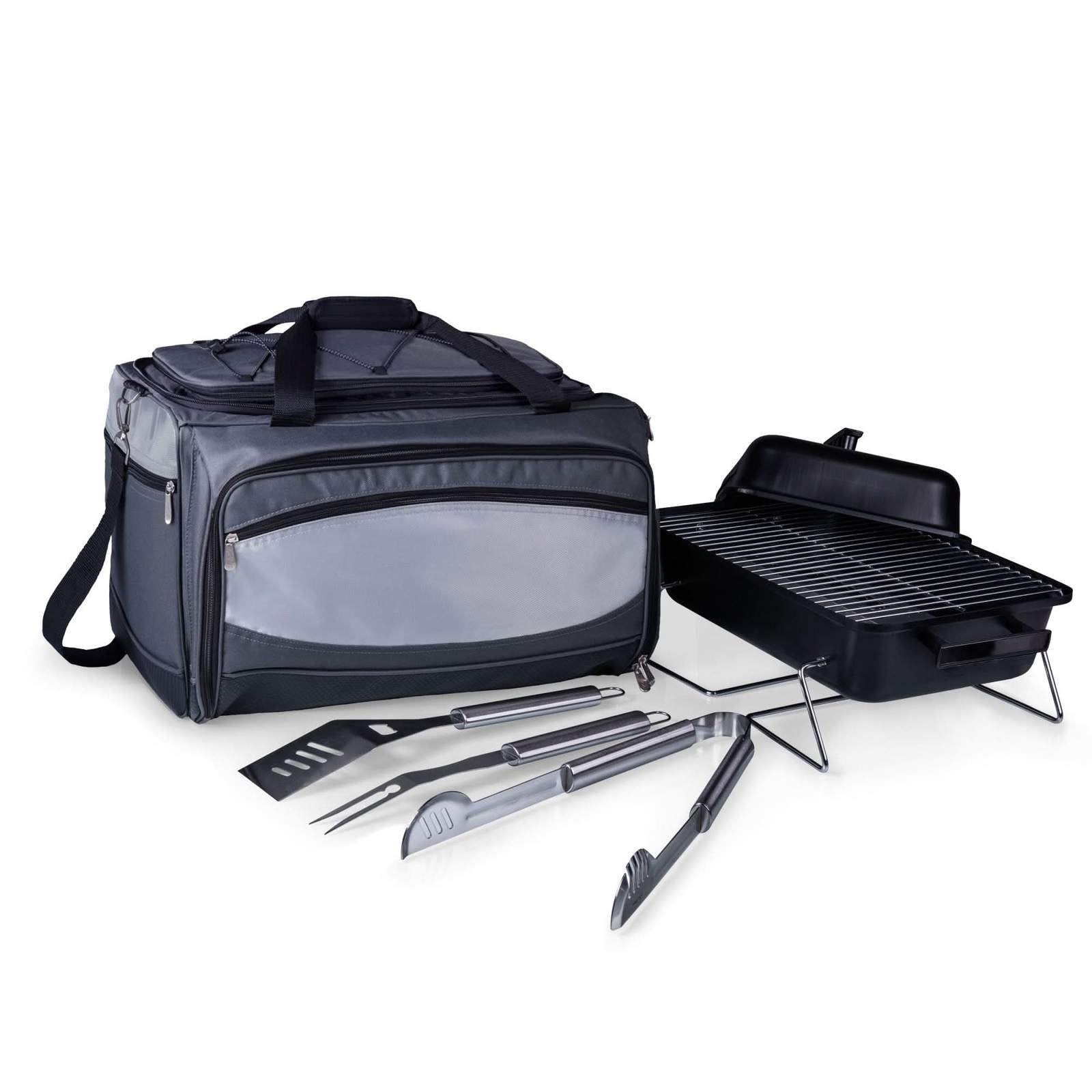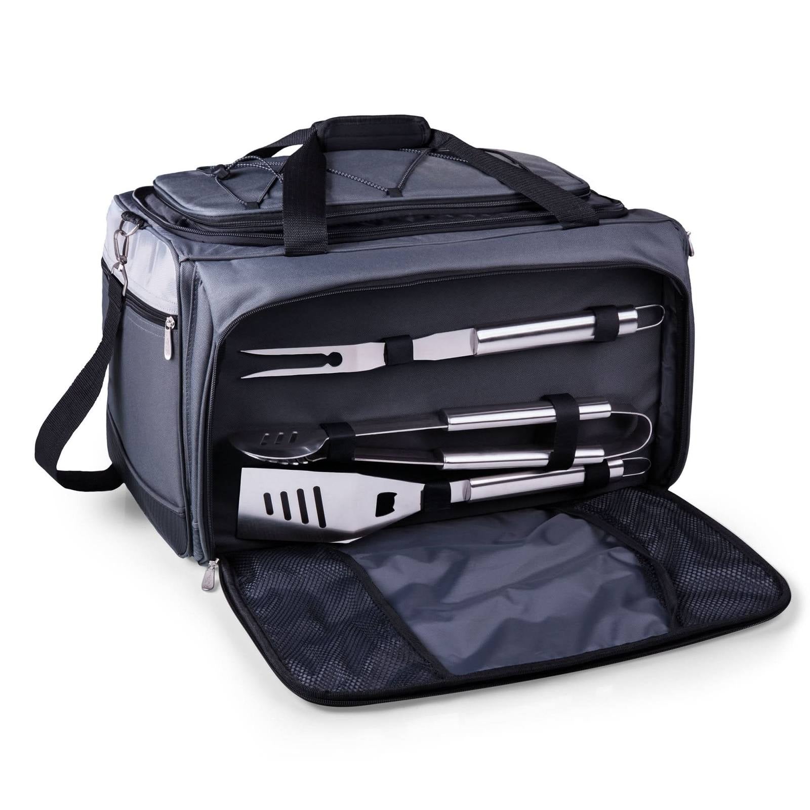 Picnic Time is proud to introduce our patented Buccaneer Portable Charcoal Grill & Cooler Tote, a travel grill set and insulated cooler in one! A 24-can capacity, fully-removable cooler nestles securely into the main compartment which holds the bbq grill and lid, and an exterior zip-up compartment holds three stainless steel grilling tools with aluminum handles and non-slip thumb grips including: one large spatula with an integrated bottle opener, one bbq fork, and tongs. With an adjustable shoulder strap with comfort pad, a reinforced waterproof base, three large zippered exterior pockets to store personal effects, padded carry handles, and a stretch cargo cord on the top of the tote to carry a blanket or towel, you'll win the tailgate party, hands down!