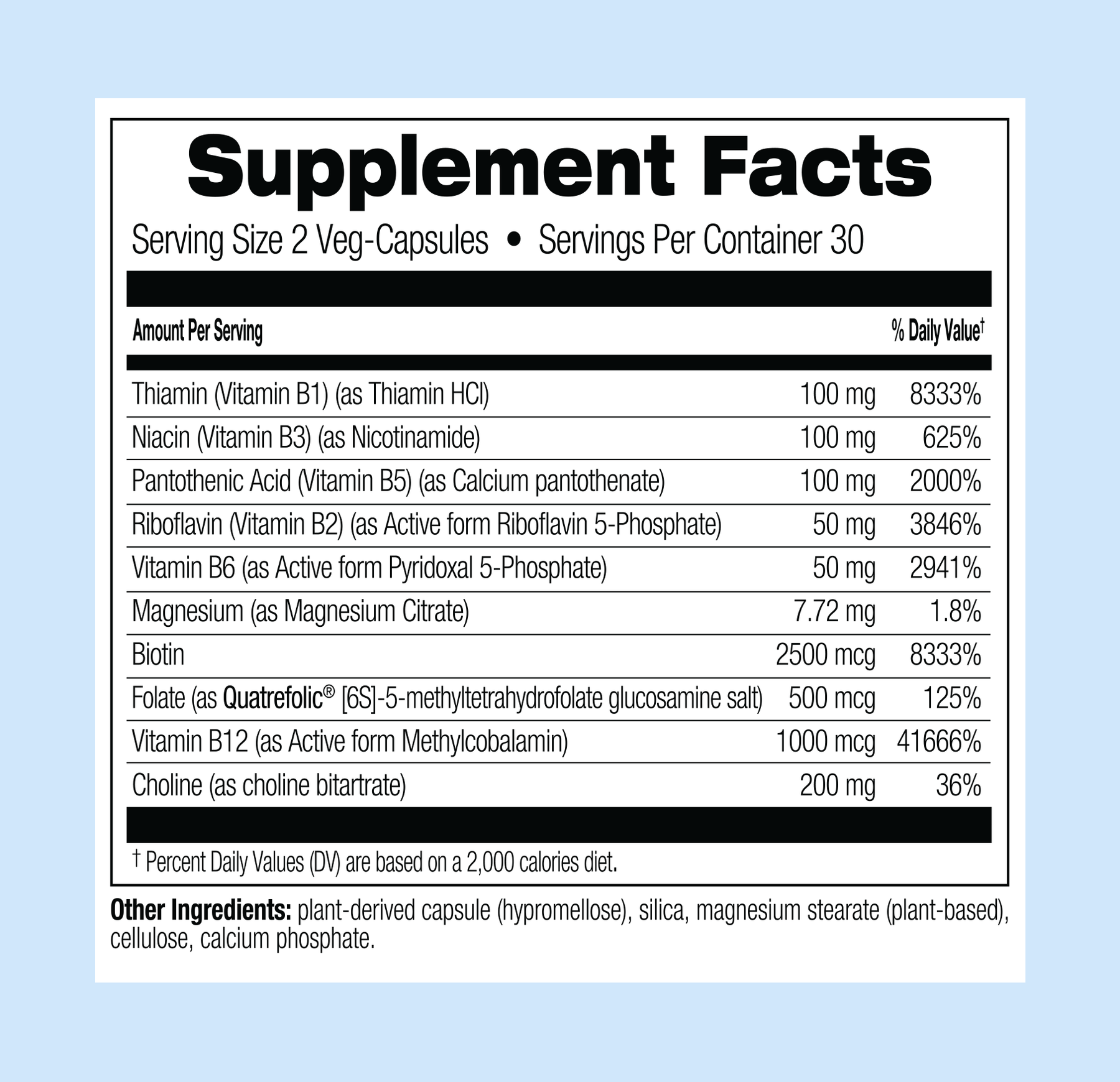 Active-B Complex™ is a high-dose activated B vitamin complex that includes methyl folate (Quatrefolic®), methylcobalamin (B12), Pyridoxal 5-phosphate P5P (B6) and Riboflavin sodium phosphate (B2), along with other specialized brain focused nutrients such as Choline. Active-B Complex supports energy production, a healthy stress response, homocysteine metabolism, and assists with the synthesis of neurotransmitters.