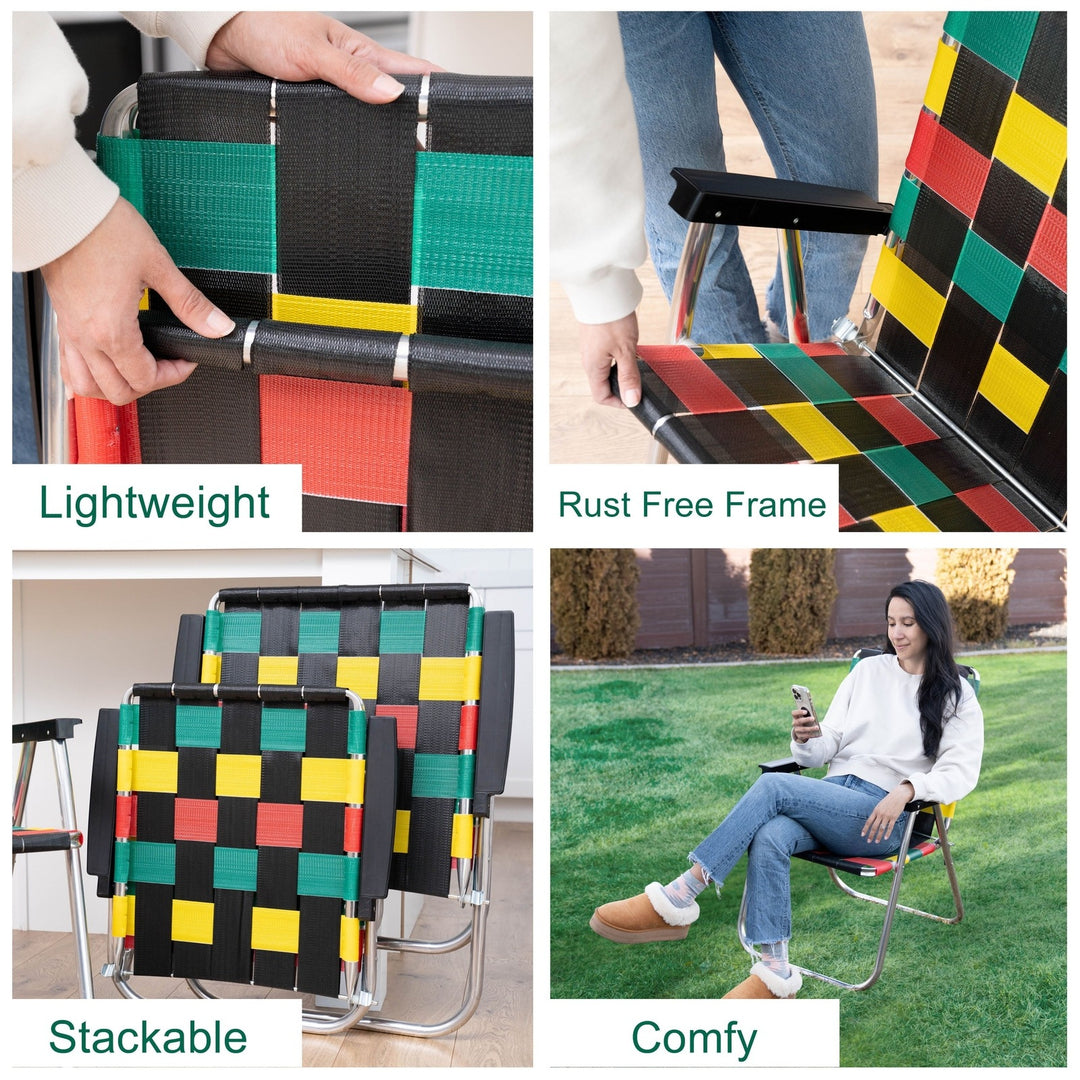 Our customers demanded it, so here it is, introducing the Rasta Chair! Made in the USA with rust free aluminum, this chair is perfect for anyone who wants to add some bright and vibrant fun to their outdoor space. Its black arm rests provide comfortable support for any activity. Get ready to liven up your patio with the Rasta Chair!