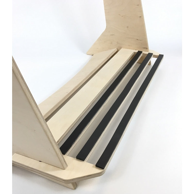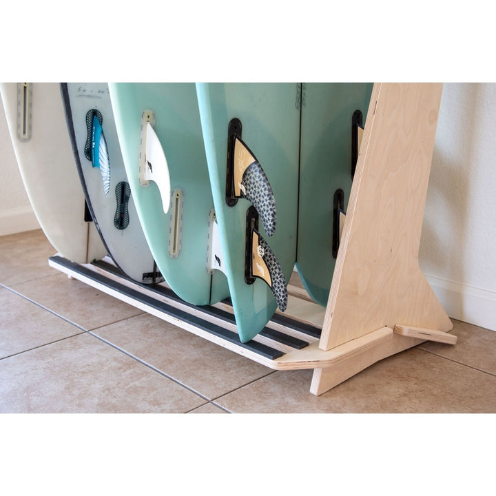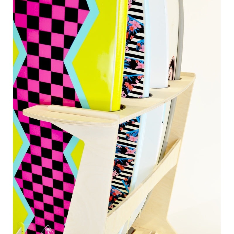 This free standing floor display rack is great for those with a collection of surfboards. Made from beautiful Baltic Birch this rack comes with premium inlaid rubber to protect your rails and thick foam padding to protect your tail.